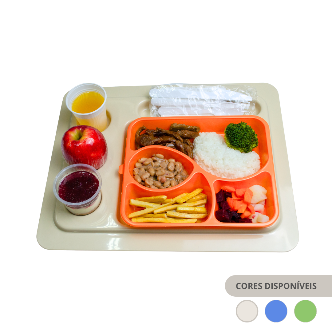 Fabricado em plástico ABS de alta resistência, possui cavidades específicas para copo de suco, sobremesa, talheres e refeição principal. Além disso, acompanha adesivo com cola atóxica e instruções de uso, reforçando a padronização e o cuidado no dia a dia.